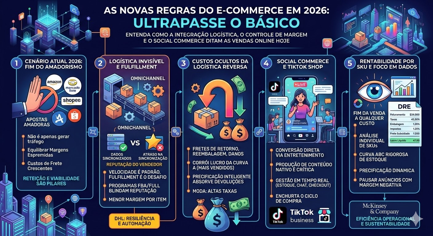 Descubra como otimizar suas vendas em marketplaces em 2026. Estratégias reais de logística, social commerce e gestão de margem com dados da McKinsey e DHL.